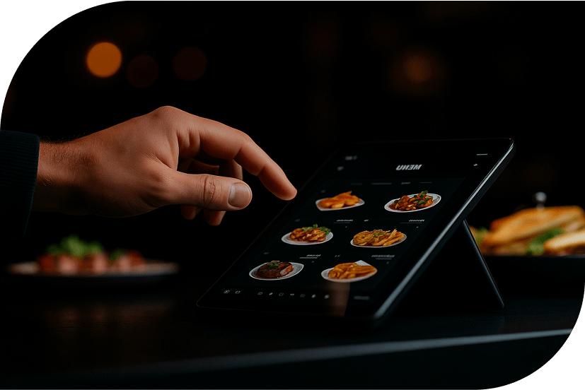 We set up your digital menu and connect it to a QR code or tablet interface. When customers scan the QR code at their table or use a provided device, they can browse, order, and send requests directly to your kitchen.